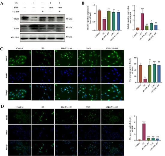 3.6. Effects of SMS on the Stub1-HSF1 Pathway in Heat-Stressed Rat H9c2 Cardiomyocytes