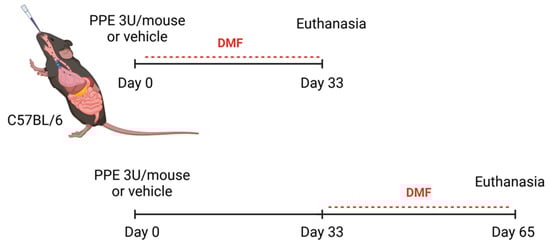 This study was conducted at the Health Sciences Center (CCS) of the Federal University of Rio de Janeiro (UFRJ) and was previously approved by the UFRJ Ethics Committee under protocol number 016/22. C57BL/6 mice, 8 weeks of age, were used in the experiments. The animals were housed in ventilated racks in the Institute of Biomedical Sciences, maintained under a 12 h reversed light–dark cycle, with a controlled temperature of 21 ± 2 °C and relative humidity of 50 ± 10%, with free access to water and food. In the first experimental design, emphysema was induced by intranasal instillation of PPE at a dose of 3 U (units/mouse), diluted in sterile saline solution. DMF was diluted in a 0.5% carboxymethylcellulose vehicle and administered by oral gavage three times a week at doses of 30 and 100 mg/kg body weight (Figure 1). The animals were divided into the following groups: control (instillation of the PPE vehicle [0.9% saline] and oral gavage of the DMF vehicle [0.5% carboxymethylcellulose in PBS]); DMF100 (instillation of the PPE vehicle and treatment control with DMF at 100 mg/kg); PPE (emphysema induced with PPE [3 U/mouse]); PPE + DMF30 (emphysema induced and treated concomitantly with DMF 30 mg/kg); PPE + DMF100 (emphysema induced and treated concomitantly with DMF 100 mg/kg). Euthanasia of the animals occurred 33 days after the induction of emphysema (Figure 1). For the second experimental design, was included a recovery period after the induction of emphysema, with groups divided as follows: control (instillation of the PPE vehicle [0.9% saline] and oral gavage of the DMF vehicle [0.5% carboxymethylcellulose in PBS]); PPEr (emphysema induced with PPE and recovery period); PPEr + DMF100 (emphysema induced with PPE, followed by post-treatment with DMF 100 mg/kg for 32 days). Treatment started on day 33, after the recovery period, and animals were sacrificed on day 65 (Figure 1).