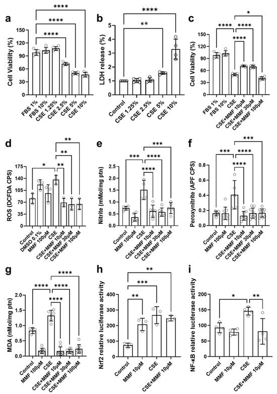 Figure 2. Effects of cigarette smoke extract (CSE) and dimethyl fumarate (DMF) on cell viability, lactate dehydrogenase (LDH) release, reactive oxygen species (ROS) production, nitrite and peroxynitrite levels, malondialdehyde (MDA) concentration, Nrf2-dependent luciferase activity, and NF-κB-dependent luciferase activity in lung (PC-9) cells. (a) Cell viability of lung cells exposed to different concentrations of CSE (1.25%, 2.5%, 5%, and 10%); (b) LDH release in lung cells exposed to different concentrations of CSE; (c) Cell viability of lung cells treated with DMF (10 µM, 30 µM, and 100 µM) in the presence of 10% CSE; (d) ROS levels in lung cells treated with DMF in the presence of CSE; (e) Nitrite concentration in lung cells treated with DMF in the presence of CSE; (f) Peroxynitrite levels in lung cells treated with DMF in the presence of CSE; (g) MDA concentration in lung cells treated with DMF in the presence of CSE; (h) Nrf2-dependent luciferase activity in lung cells treated with DMF in the presence of CSE; (i) NF-κB-dependent luciferase activity in lung cells treated with DMF in the presence of CSE. Data are expressed as mean ± standard deviation from independent experiments. Statistical analysis was performed by using one-way ANOVA with Bonferroni post hoc test. * p < 0.05; ** p < 0.01; *** p < 0.001; **** p < 0.0001. The sample size for each column in the graphs is indicated by open circles.