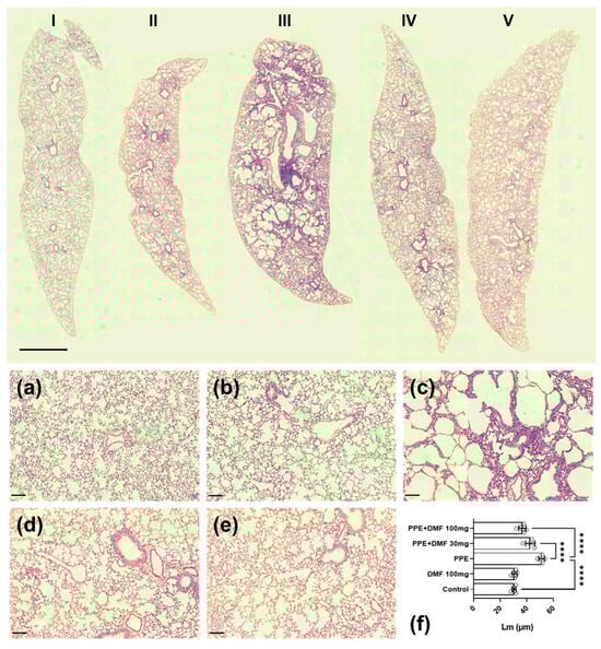 Figure 3. Histological sections of lungs stained with Hematoxylin and Eosin (H&E). On top, slides were scanned and represent each experimental group as indicated. The control group received only the vehicle (I); the DMF group received dimethyl fumarate (DMF) at 100 mg/kg (II); the PPE group was instilled with elastase, showing signs of emphysema and alveolar destruction (III); the PPE + DMF30 group was instilled with elastase and concomitantly treated with DMF at 30 mg/kg (IV); and the PPE + DMF100 group was instilled with elastase and concomitantly treated with DMF at 100 mg/kg (V). The latter two groups exhibited significant improvement in lung histology compared to the PPE group. Objective: 2×. Scale bar = 2 mm. On down, representative images of lung histology showing that DMF prevented the development of porcine pancreatic elastase (PPE)-induced pulmonary emphysema in a murine experimental model. (a) Control group; (b) DMF group (100 mg/kg); (c) PPE group (3 U/mouse); (d) PPE group treated with DMF 30 mg/kg; (e) PPE group treated with DMF 100 mg/kg; (f) Quantification of mean alveolar diameter (Lm). Objective: 20×, scale bar = 100 µm. Data are expressed as mean ± standard deviation from independent experiments. Statistical analysis was performed by using one-way ANOVA with Bonferroni post hoc test. **** p < 0.0001. The sample size for each column in the graphs is indicated by open circles.