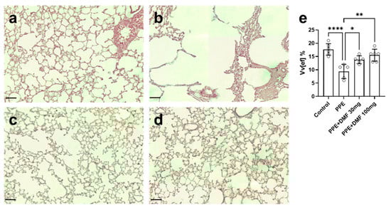 These morphological changes were accompanied by a reduction in pulmonary elastic fiber distributions, as evidenced by orcein staining (Figure 4). Figure 4a represents the control group, showing characteristic staining of preserved elastic fibers in the alveolar septa. In the emphysematous group (Figure 4b), reduced orcein staining indicated a decrease in elastic fiber tissue distribution. Figure 4c,d demonstrate that elastic fibers were preserved in the DMF-treated groups at both 30 mg/kg and 100 mg/kg doses. Stereological analysis of elastic fibers, quantifying the volume density of the pulmonary elastic component, revealed that DMF treatment prevented the PPE-induced reduction in these tissue structures, with the 100 mg/kg dose being the most effective (Figure 4e).
