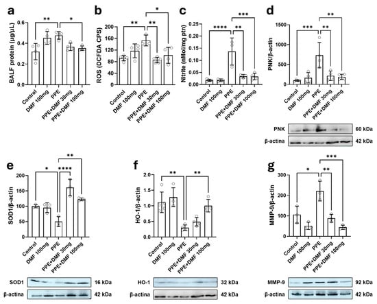 Figure 5. Effects of dimethyl fumarate (DMF) on bronchoalveolar lavage fluid (BALF) protein content, reactive oxygen species (ROS), nitrite, nitrotyrosine (product of tyrosine nitration mediated by reactive nitrogen species, PNK), superoxide dismutase 1 (SOD1), heme oxygenase 1 (HO-1), and matrix metalloproteinase 9 (MMP-9) in a murine model of porcine pancreatic elastase (PPE)-induced pulmonary emphysema. (a) BALF protein concentration; (b) ROS levels in BALF cells, measured by DCFDA; (c) Nitrite concentration in lung tissue; (d) PNK expression in lung tissue, normalized to β-actin, with Western blot images below; (e) SOD1 expression, normalized to β-actin; (f) HO-1 expression, normalized to β-actin; (g) MMP-9 expression, normalized to β-actin. In some cases (HO-1 and PNK), multiple proteins were evaluated from the same blot, and the loading control from that blot was then used for more than one protein. Data represent mean ± standard deviation from independent experiments. Statistical analysis was performed using one-way ANOVA with Bonferroni post hoc test (* p < 0.05; ** p < 0.01; *** p < 0.001; **** p < 0.0001). Sample sizes for each group are indicated by open circles. Uncropped Western blots for PNK, SOD1, HO-1, and MMP-9 are provided in Supplementary Figures S4–S7.