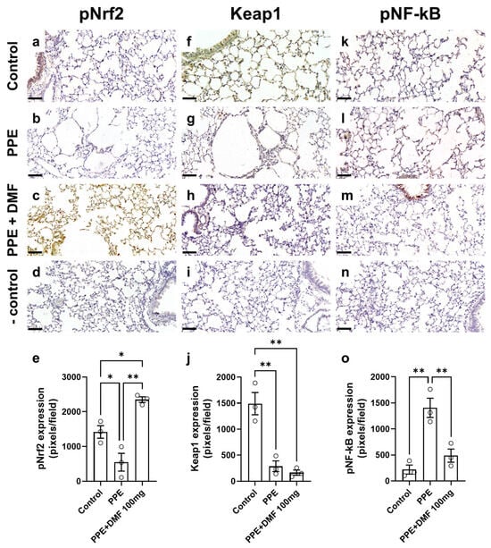 Figure 6. Representative imagens of lung immunohistochemistry for phosphorylated Nrf2, NF-κB, and Keap1 during porcine pancreatic elastase (PPE)-induced pulmonary emphysema in a murine experimental model. Diaminobenzidine was employed as a chromogen in the final step of the reaction. pNrf2, Keap1, and pNF-κB were visualized as brown staining in a subset of cells. pNrf2: (a) control group; (b) PPE group; (c) PPE + DMF (100 mg/kg) group; (d) negative control (non-primary antibody is used); (e) quantification of pNrf2 tissue expression. Keap1: (f) control group; (g) PPE group; (h) PPE + DMF (100 mg/kg) group; (i) negative control (non-primary antibody is used); (j) quantification of Keap1 tissue expression. pNF-κB: (k) control group; (l) PPE group; (m) PPE + DMF (100 mg/kg) group; (n) negative control (non-primary antibody is used); (o) quantification of Keap1 tissue expression. Data are expressed as mean ± standard deviation from independent experiments. Statistical analysis was performed by using one-way ANOVA with Bonferroni post hoc test. * p < 0.05 and ** p < 0.01. The sample size for each column in the graphs is indicated by open circles. Objective: 20×, scale bar = 100 µm.