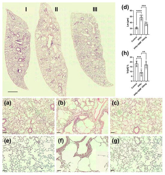 Figure 7. Histological sections of lungs stained with Hematoxylin and Eosin (H&E) and Orcein. On top, slides were scanned and represent each experimental group as indicated. The control group received only the vehicle (I); the PPEr group was instilled with elastase and maintained until 65 days, showing few signs of emphysema and alveolar destruction (II); the PPEr + DMF100 group was instilled with elastase and treated with DMF at 100 mg/kg started at day 33 (III). The latter group exhibited significant improvement in lung histology compared to the PPEr group. Objective: 2×. Scale bar = 2 mm. On down, representative images of lung histology stained with H&E (ac) or orcein (eg) showing that DMF reverted emphysema lesions caused by porcine pancreatic elastase (PPE) in a murine experimental model. (a or e) Control group; (b or f) PPEr group (3 U/mouse); (c or g) PPE group treated with DMF 100 mg/kg; (d) Quantification of mean alveolar diameter (Lm); (h) Volume density of elastic fibers by stereology. Objective: 20× for H&E with scale bar = 100 µm. Objective: 40× for orcein with scale bar = 50 µm. Data are expressed as mean ± standard deviation from independent experiments. Statistical analysis was performed by using one-way ANOVA with Bonferroni post hoc test. ** p < 0.01; *** p < 0.001; **** p < 0.0001. The sample size for each column in the graphs is indicated by open circles.