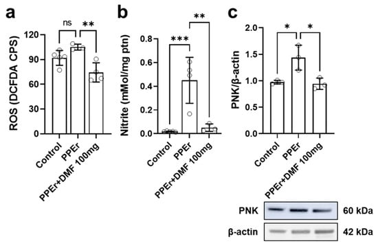 Figure 8. Effects of dimethyl fumarate (DMF) on the reactive oxygen species (ROS), nitrite levels, and nitrotyrosine (product of tyrosine nitration mediated by reactive nitrogen species) (PNK) during porcine pancreatic elastase (PPE)-induced pulmonary emphysema in a murine experimental model. (a) ROS levels in BALF cells, measured by DCF; (b) Nitrite concentration in lung tissue; (c) PNK expression in lung tissue, normalized to β-actin. The image below the graph shows Western blot results for PNK and β-actin. Data are expressed as mean ± standard deviation from independent experiments. Statistical analysis was performed by using one-way ANOVA with Bonferroni post hoc test. The "ns" in Figure 8a indicates no statistical significance. * p < 0.05; ** p < 0.01; *** p < 0.001. The sample size for each column in the graphs is indicated by open circles. Uncropped and unedited Western blot membrane for PNK is provided in supplementary material (Figure S8).