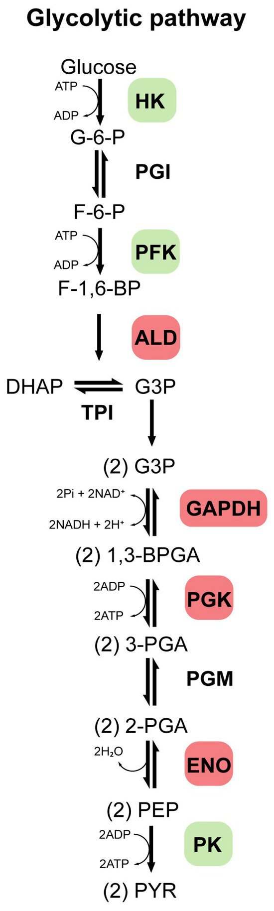 Glycolytic pathway. This pathway comprises 10 enzymatically catalyzed steps, with regulation primarily occurring through the enzymes hexokinase (HK), phosphofructokinase (PFK), and pyruvate kinase (PK), which catalyze reactions that are essentially irreversible under physiological conditions. Additionally, other enzymes such as aldolase (ALD), glyceraldehyde-3-phosphate dehydrogenase (GAPDH), phosphoglycerate kinase (PGK), and enolase (ENO), are also highlighted, as they may play essential roles in glycolytic regulation and are associated with the development of various diseases. Other enzymes such as phosphoglucose isomerase (PGI), triosephosphate isomerase (TPI), and phosphoglycerate mutase (PGM) are also involved in this pathway. A series of intermediate compounds is formed as glucose is progressively broken down into pyruvate. These intermediates are successively: glucose 6-phosphate (G-6-P), fructose 6-phosphate (F-6-P), fructose 1,6-bisphosphate (F-1,6-BP), dihydroxyacetone phosphate (DHAP), glyceraldehyde 3-phosphate (G-3-P), 1,3-bisphosphoglycerate (1,3-BPGA), 3-phosphoglycerate (3-PGA), 2-phosphoglycerate (2-PGA), phosphoenolpyruvate (PEP), pyruvate (PYR).