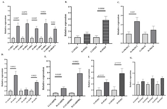 Relative mRNA expression of genes encoding GE isoforms in the peripheral blood (PB) of patients with alcohol use disorder (AUD) and healthy controls. (A) Genes encoding hexokinase (HK) isoforms, (B) phosphofructokinase (PFK) isoforms, (C) pyruvate kinase (PK) isoforms, (D) aldolase (ALD) isoforms, (E) glyceraldehyde-3-phosphate dehydrogenase (GAPDH) isoforms, (F) phosphoglycerate kinase (PGK) isoforms, and (G) enolase (ENO) isoforms. Data are presented as relative expression compared to the control group (Data are mean ± SEM). Differences between groups were assessed using the Mann–Whitney U test. Exact p-values are shown in the figure. Control group n = 7, AUD group n = 11.