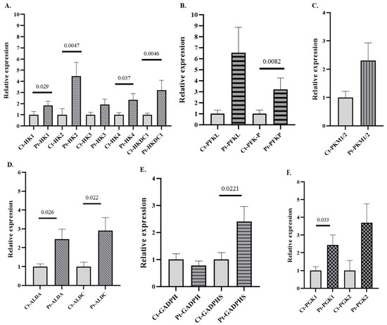 Relative mRNA expression of genes encoding GE isoforms in the peripheral blood (PB) of individuals with acute alcohol consumption (AAC) and healthy controls. (A) Genes encoding hexokinase (HK) isoforms, (B) phosphofructokinase (PFK) isoforms, (C) pyruvate kinase (PK) isoforms, (D) aldolase (ALD) isoforms, (E) glyceraldehyde-3-phosphate dehydrogenase (GAPDH) isoforms, and (F) phosphoglycerate kinase (PGK) isoforms. Data are presented as relative expression compared to the control group (Data are mean ± SEM). Differences between groups were assessed using the Mann–Whitney U test. Exact p-values are shown in the figure. Control group n = 7, AAC group n = 7.