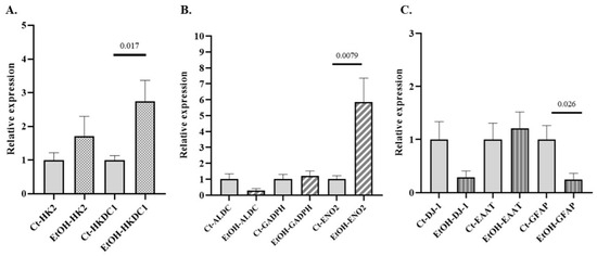Relative mRNA expression of selected genes in primary mouse astrocyte cultures exposed to ethanol. (A) Relative expression of genes encoding isoforms of GEs associated with NDD: (A) HK2 and HKDC1 (hexokinase isoforms) and (B) aldolase isoform C (ALDC)glyceraldehyde-3-phosphate dehydrogenase (GADPH), neuron-specific enolase isoform 2 (ENO2). (C) Relative expression of genes related to astrocytic identity and functionality: glial fibrillary acidic protein (GFAP), parkinsonism-associated deglycase (DJ-1), and excitatory amino acid transporter (EAAT). Data are presented as relative expression compared to the control group (Data are mean ± SEM). Differences between groups were assessed using the Mann–Whitney U test. Exact p-values are shown in the figure. Control group n = 6; ethanol-treated group n = 6.