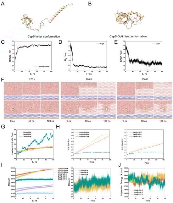 To provide preliminary evidence for the role of CspB in inhibiting ice crystal growth, we utilized molecular simulation techniques to focus on its interactions with water molecules and its inhibitory effects on ice crystallization. Using the PIK4 water model, we simulated ice structures at temperatures of 270 K, 260 K, and 250 K. Initially, homology modeling of the CspB protein amino acid sequence was performed based on the Alpha Fold-predicted A0A2N1FA94 template, which had 100% coverage and 74.67% sequence identity (Figure 1A). Subsequently, the simulated conformations were refined (Figure 1B), and the system’s equilibrium state was confirmed by monitoring RMSD, RG, and SASA values (Figure 1C–E).