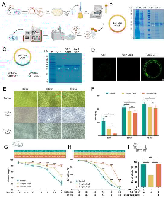 We also evaluated the cryopreservation survival rates of bovine MII oocytes. Compared with the vitrification group (n = 121, 85.73% ± 2.55%), the 0% DMSO group (n = 113, 46.87% ± 1.46%, p < 0.001) exhibited a significantly lower survival rate. However, the survival rate of the 15% EG + 2 mg/mL CspB protein group (n = 101, 87.53% ± 2.02%, p > 0.05) was comparable to the vitrification group (Figure 2I). These results suggested that the CspB protein can replace DMSO in vitrification solutions to enhance the cryopreservation survival rates of both mouse and bovine MII oocytes.