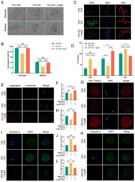 Oxidative stress is a pivotal indicator of apoptosis. By assessing the protein expression levels of Caspase-3 and Caspase-9 (Figure 3I,K), we observed a significant elevated in both proteins in oocytes from the 15% EG group compared to the 15% CPA group (p < 0.001), while no notable difference was detected in the 15% EG + 2 mg/mL CspB group (p > 0.05) (Figure 3J,L). In summary, the incorporation of CspB protein into the cryopreservation solution effectively alleviates oxidative stress and mitochondrial damage in mouse oocytes post-freezing and inhibits the apoptotic process.