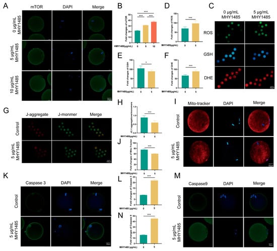 MHY1485, an mTOR activator, diminishes the quality of cryopreserved mouse oocytes treated with 15% EG + 2 mg/mL CspB. (A) Representative images of mTOR in mouse oocytes after the addition of various concentrations of MHY1485 and (B) their fluorescence intensities. (C) Representative images of ROS, GSH, and DHE in mouse oocytes post-MHY1485 addition. (D) ROS, (E) GSH, and (F) DHE fluorescence intensities in mouse oocytes with MHY1485. (G,I) Representative images of mitochondria and their fluorescence intensities (H,J) in mouse oocytes with MHY1485. (K) Representative images of Caspase-3 and their fluorescence intensities (L) in mouse oocytes with MHY1485 addition. (M) Representative images of Caspase-9 and their fluorescence intensities (N) in mouse oocytes with MHY1485. Significant differences (***, p < 0.001; *, p < 0.05) are noted.