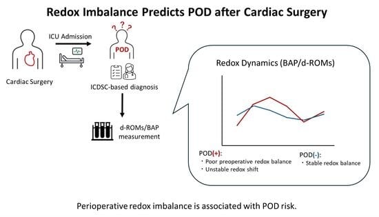 Arai, Y.; Koyama, Y.; Takahashi, A.; Shimada, S.; Yoshida, T. Temporal Dynamics of Perioperative Redox Balance and Its Association with Postoperative Delirium After Cardiac Surgery. Antioxidants 2026, 15, 108. https://doi.org/10.3390/antiox15010108