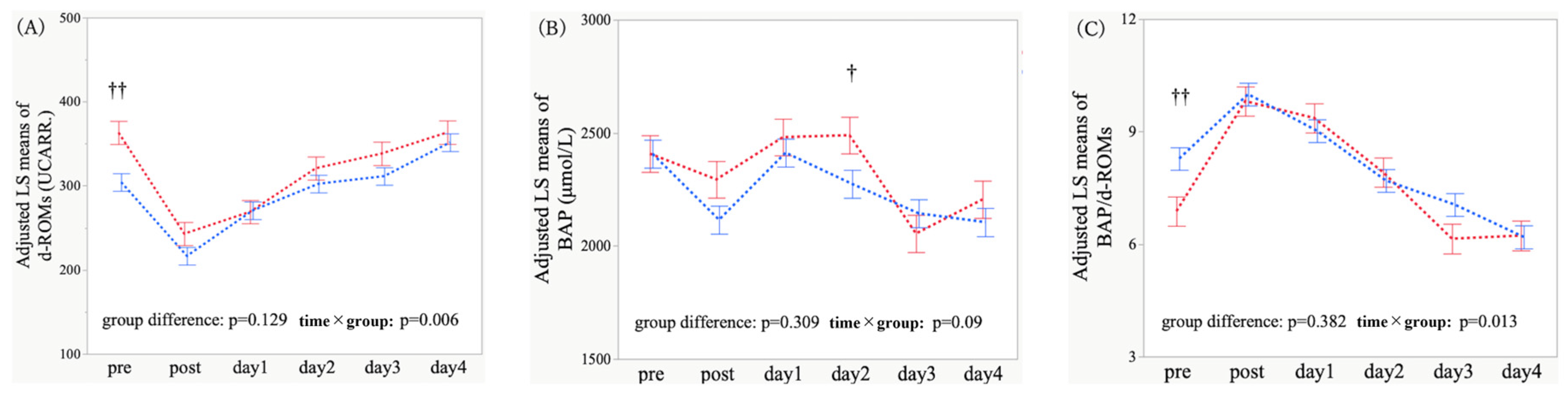 3.2. Temporal Trajectories and Time-Point Comparisons of Oxidative Stress Markers