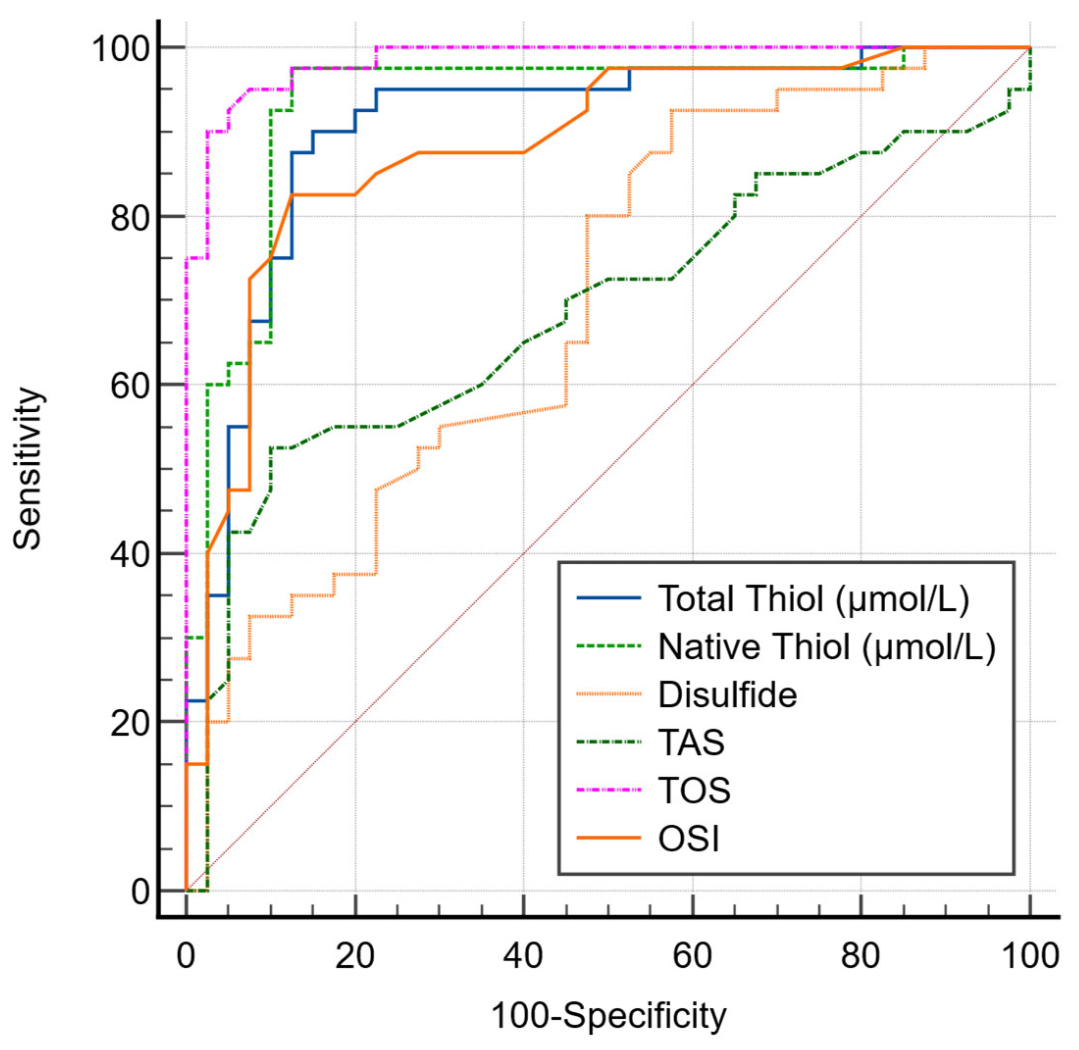 The AUC values of OS parameters TT (µmol/L), NT (µmol/L), and disulfide were found to be 0.907, 0.934, and 0.694, respectively (
