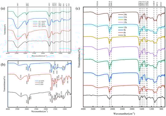 The FTIR spectra of natural pollen and sporopollenin samples treated for different acidolysis durations were recorded using a spectrometer (Thermo Fisher Scientific iS10, Waltham, MA, USA with the KBr pellet technique. All spectra were collected at a resolution of 4 cm−1 with 32 scans over the range of 4000–400 cm−1 to characterize the variations in functional groups and chemical composition of sporopollenin before and after chemical treatment.