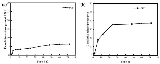 In vitro release profiles of Ca-Alg@PO-SECs. (a) Release profile in simulated gastric fluid (SGF). (b) Release profile in simulated intestinal fluid (SIF). Data are presented as mean ± SD (n = 3).