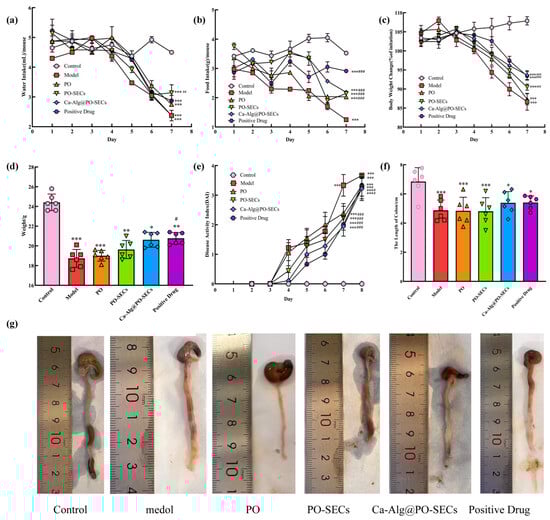 Figure 9a,b shows that daily food and water intake stayed stable in the Control group, confirming normal physiological status. In contrast, all five colitis-induced groups (Model, PO, PO-SECs, Ca-Alg@PO-SECs, Positive Drug) had a significant decline in food intake during later stages (p < 0.001). This confirms that the acute colitis model was successful and highlights the severe impact of colitis on feeding behavior.