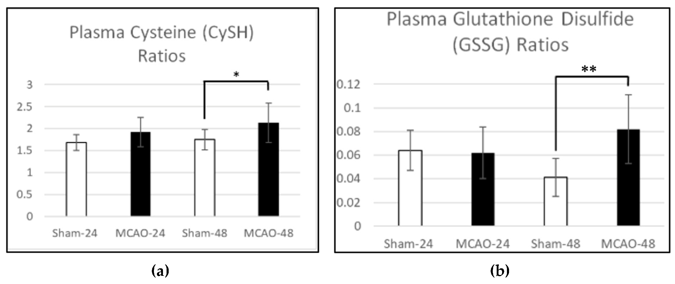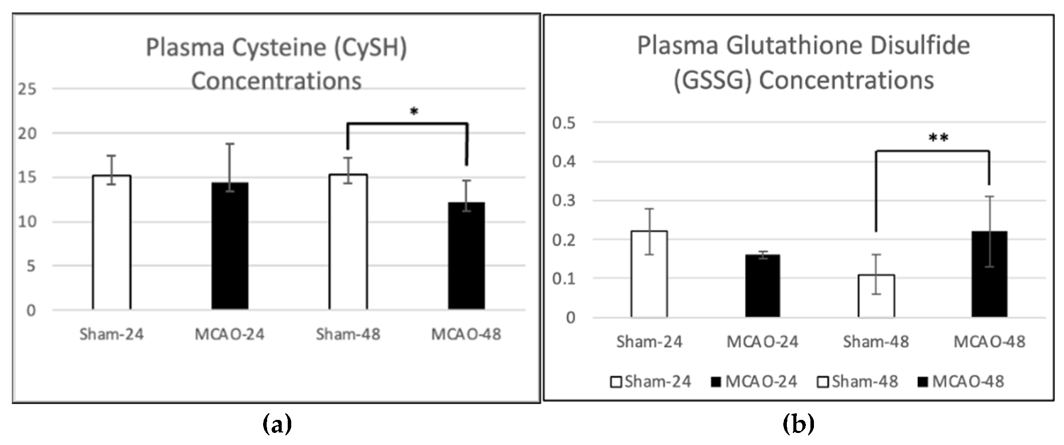 | CySH (µM) | 48 h | 15.31 ± 1.86 | 12.22 ± 2.38 | 0.016 * | Decreased in MCAO |