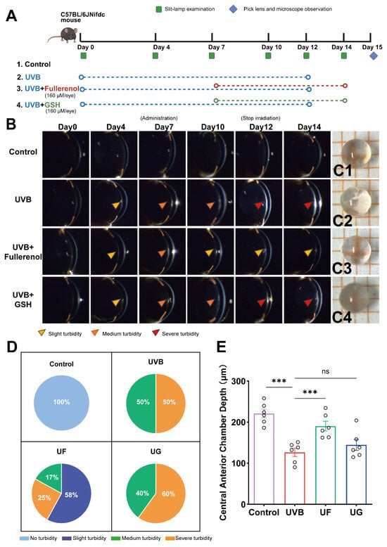 Protective effects of Fullerenol on UVB-induced lens injury in mice. (A) Experimental design showing the schedule of UVB irradiation, eye-drop administration (Fullerenol, 160 μM/eye; GSH, 160 μM/eye), and slit-lamp or microscopic examinations in C57BL/6J mice. (B) Representative slit-lamp images of lenses from each group (control, UVB, UVB + Fullerenol, UVB + GSH) on Days 0, 4, 7, 10, 12, and 14. Arrowheads indicate the degree of turbidity: yellow—slight, orange—moderate, red—severe. (C1–C4) Microscopic views of isolated lenses on Day 15. (D) Proportional distribution of lens turbidity grades in each group on Day 14 (n = 12 eyes per group). (E) Quantification of central anterior chamber depth on Day 14 (n = 6 eyes per group). Data are presented as mean ± SEM. Statistical significance was assessed using one-way ANOVA followed by Tukey’s post hoc test; ns: p > 0.05; *** p < 0.001.