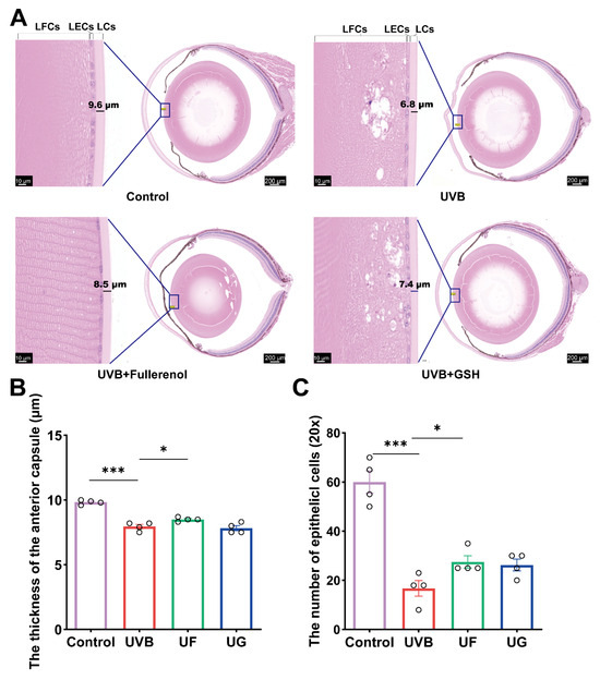 Hematoxylin and eosin (H&E) staining was performed to assess the anterior capsule thickness and lens epithelial cell (LEC) density. UVB exposure markedly reduced the LEC numbers, thinned the anterior capsule, and caused severe cortical injury characterized via fiber disorganization and large vacuoles at the anterior pole (Figure 2A). Treatment with either GSH or Fullerenol reduced the size of the lens fiber vacuoles. Crucially, the Fullerenol treatment specifically resulted in thickening of the lens anterior capsule, a significant reduction in fiber cavities, and an increase in epithelial cell numbers. No additional ocular tissue abnormalities were observed following the Fullerenol administration (Figure 2A). Quantitative analysis confirmed that Fullerenol significantly improved the anterior capsule thickness and LEC counts compared with the UVB and GSH groups (Figure 2B,C; p < 0.05). In Supplementary Figure S3C, H&E staining of paraffin-embedded retinal sections show no apparent structural abnormalities following treatment with 160 μM Fullerenol, indicating that Fullerenol did not induce detectable retinal toxicity under the current experimental conditions.