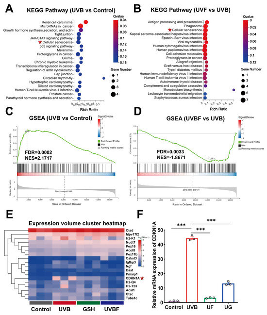 Transcriptomic profiling reveals senescence- and stress-related pathways modulated by Fullerenol. (A,B) KEGG enrichment analysis of differentially expressed genes (DEGs) in UVB vs. control and UVB + Fullerenol (UVF) vs. UVB. Cellular-senescence-related pathways were among the most significantly enriched categories. The red circle represents high expression. (C,D) Gene set enrichment analysis (GSEA) highlighting enrichment of senescence-related signaling pathways in UVB vs. control (C) and their suppression by the Fullerenol treatment (D). (E) Heatmap of representative senescence- and stress-related genes across groups. (F) Relative Cdkn1a mRNA expression validated by qPCR in mouse lenses (n = 3 per group). Data are presented as mean ± SEM. *** p < 0.001 by one-way ANOVA followed by Tukey’s post hoc test. The red stars in the figure indicates the signaling pathways/target genes validated in this study.