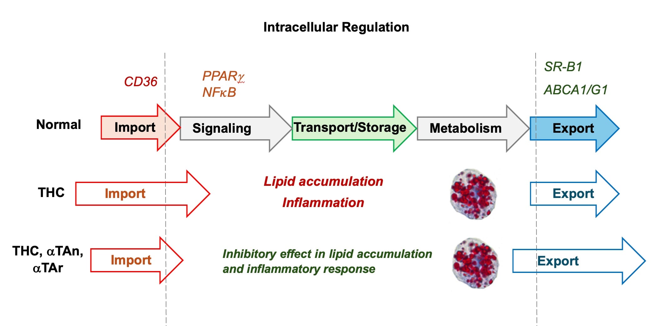 Cannabinoids can bind to several cannabinoid receptors and modulate cellular signaling and gene expression relevant to inflammation and lipid homeostasis. Likewise, several vitamin E analogs can modulate inflammatory signaling and foam cell formation in macrophages by antioxidant and non-antioxidant mechanisms. We analyzed the regulatory effects on the expression of genes involved in cellular lipid homeostasis (e.g., CD36/FAT cluster of differentiation/fatty acid transporter and scavenger receptor SR-B1) and inflammation (e.g., inflammatory cytokines, TNFα, IL1β) by cannabinoids (cannabidiol (CBD) and Δ9-tetrahydrocannabinol (THC)) in human THP-1 macrophages with/without co-treatment with natural alpha-tocopherol (RRR-αT), natural RRR-αTA (αTAn), and synthetic racemic all-rac-αTA (αTAr). In general, αTAr inhibited both lipid accumulation and the inflammatory response (TNFα, IL6, IL1β) more efficiently compared to αTAn. Our results suggest that induction of CD36/FAT mRNA expression after treatment with THC can be prevented, albeit incompletely, by αTA (either αTAn or αTAr) or CBD. A similar response pattern was observed with genes involved in lipid efflux (ABCA1, less with SR-B1), suggesting an imbalance between uptake, metabolism, and efflux of lipids/αTA, increasing macrophage foam cell formation. THC increased reactive oxygen species (ROS), and co-treatment with αTAn or αTAr only partially prevented this. To study the mechanisms by which inflammatory and lipid-related genes are modulated, HEK293 cells overexpressing cannabinoid receptors (CB1 or TRPV-1) were transfected with luciferase reporter plasmids containing the human CD36 promoter or response elements for transcription factors involved in its regulation (e.g., LXR and NFκB). In cells overexpressing CB1, we observed activation of NFκB by THC that was inhibited by αTAr.