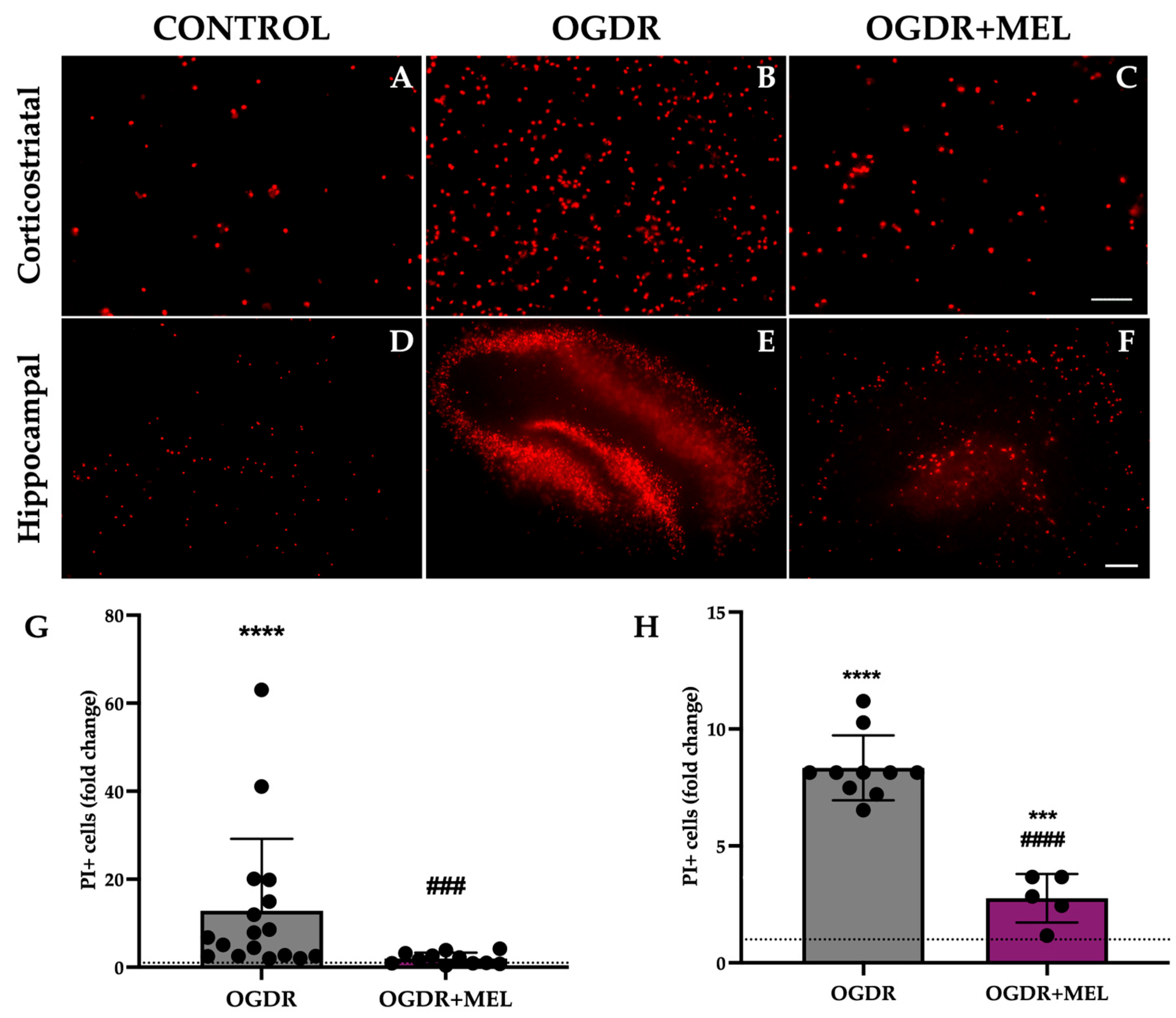 Figure 1. Cell death in corticostriatal and hippocampal slice cultures after OGDR and melatonin treatment. Cultures were subjected to 1 h (corticostriatal) or 45 min (hippocampal) of OGD and immediately treated with 50 μM melatonin followed by 24 h of reperfusion. Cell death was measured by PI uptake (AF). Representative microphotographs of PI fluorescence in each of the experimental groups of the two regions ((AC) Scale bar: 50 μm, (DF) scale bar: 200 μm). (G,H). Graphs show PI+ cell counts in corticostriatal (G) and hippocampal (H) regions. n for control, OGDR and OGDR+MEL in the corticostriatal region was 16, 17 and 11 slices, respectively. n for control, OGDR and OGDR+MEL in the hippocampal region was 19, 10 and 5 slices, respectively. The dotted line at y = 1 represents the control values. *** p < 0.001 or **** p < 0.0001 vs. control group; ### p < 0.001 or #### p < 0.0001 vs. OGDR group.
