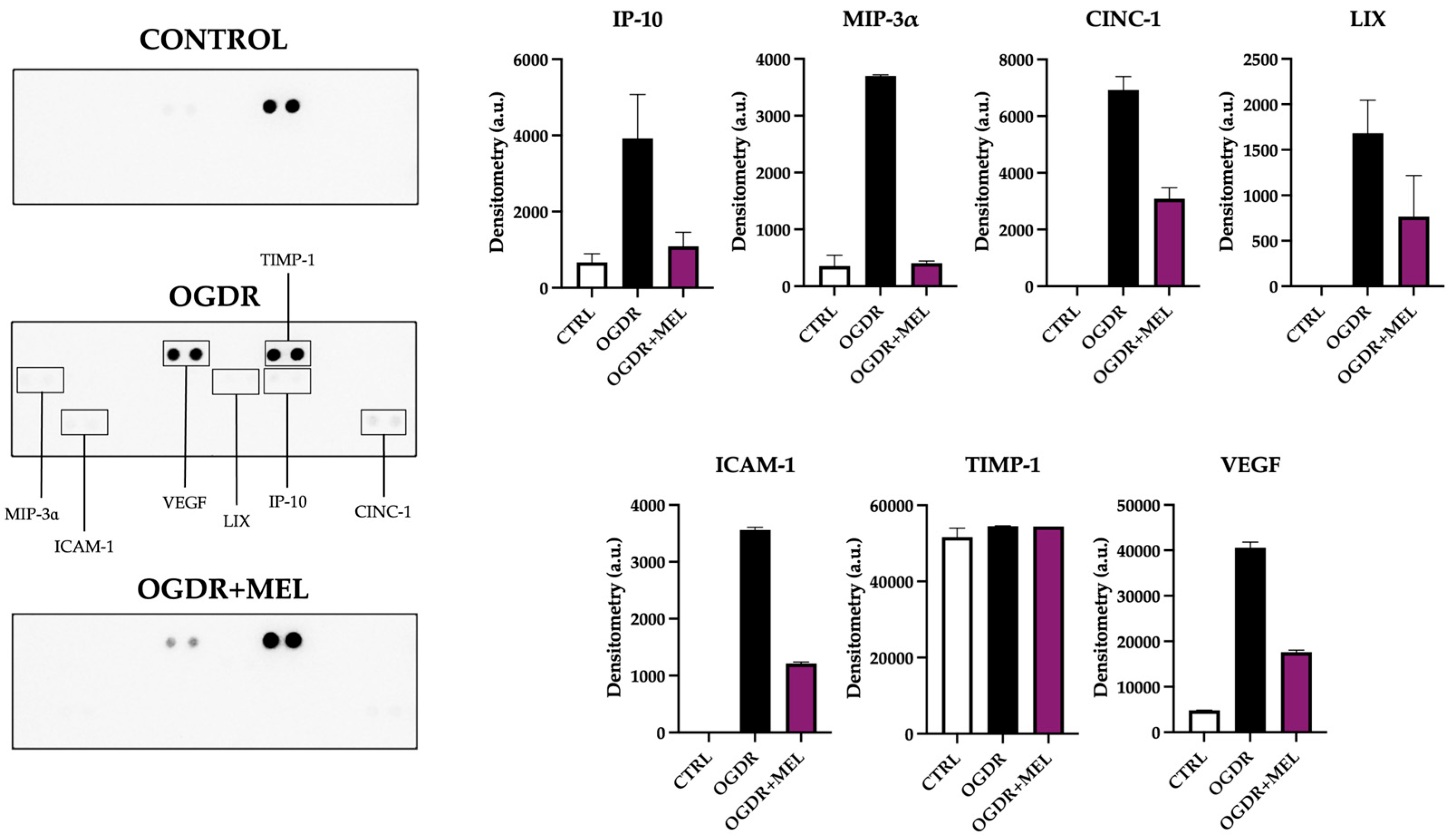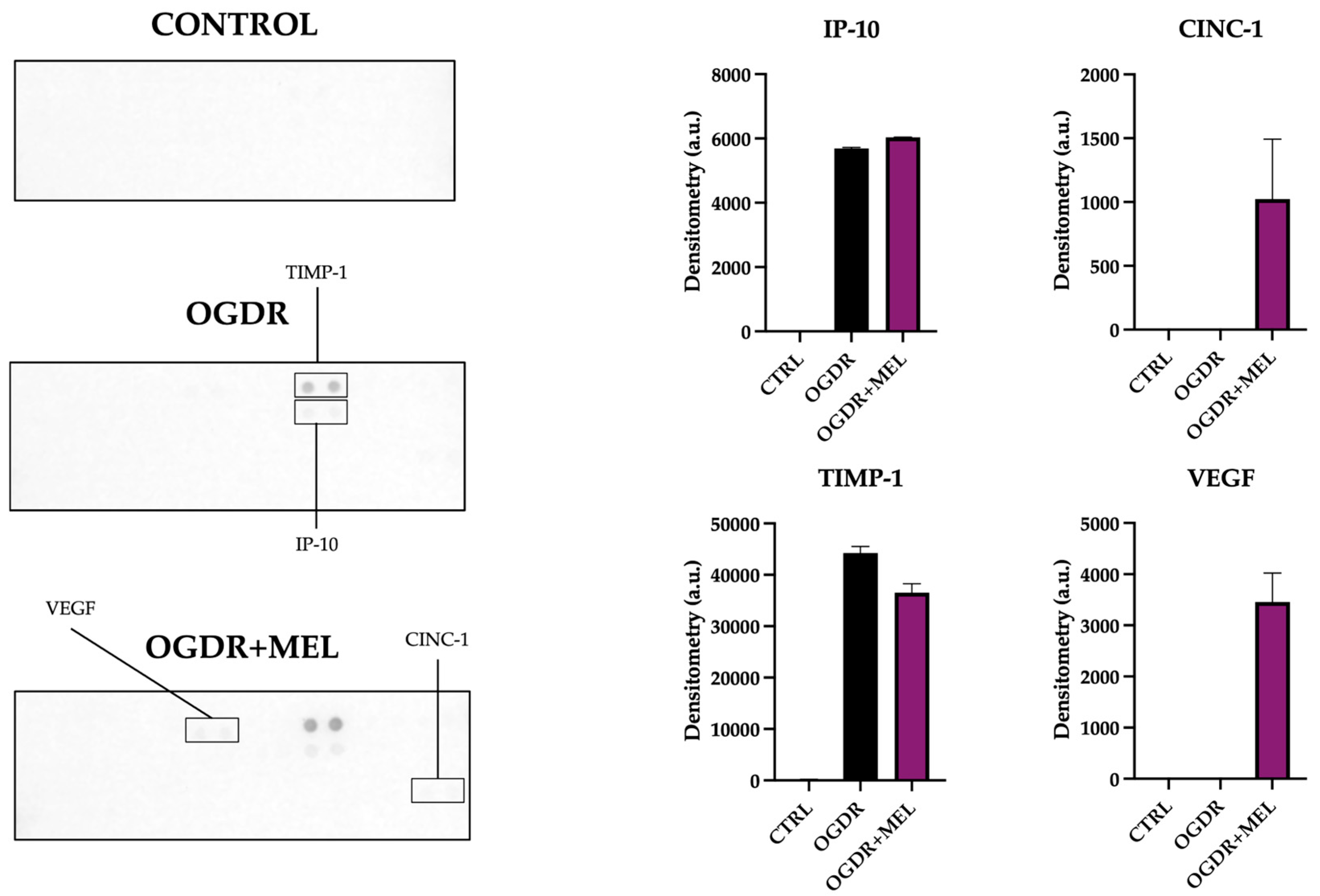 Figure 4. Proteome profile of the hippocampal region after OGDR and melatonin treatment. Hippocampal cultures were subjected to 45 min of OGD and immediately treated with 50 μM melatonin followed by 24 h of reperfusion. The proteome profile of supernatants was assessed using a membrane-based sandwich immunoassay (left side of the figure). The following were detected (graphs, right side of the figure): IP-10, CINC-1, TIMP-1 and VEGF. n was 10 slices in each experimental group. Samples were pooled and pixel densitometry was measured in duplicate.