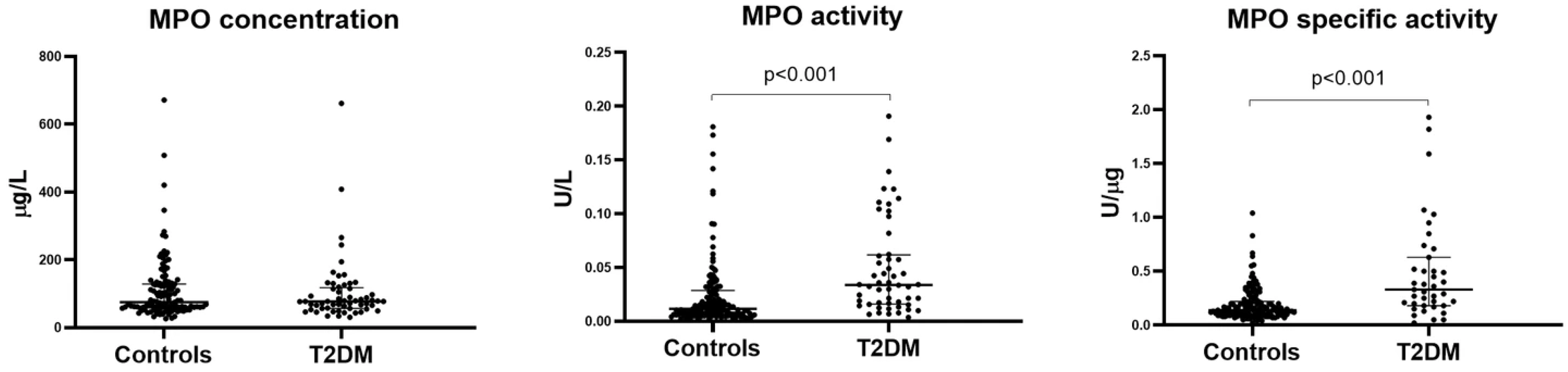 3.2. MPO Activity, Concentration, and -Specific Activity in T2DM