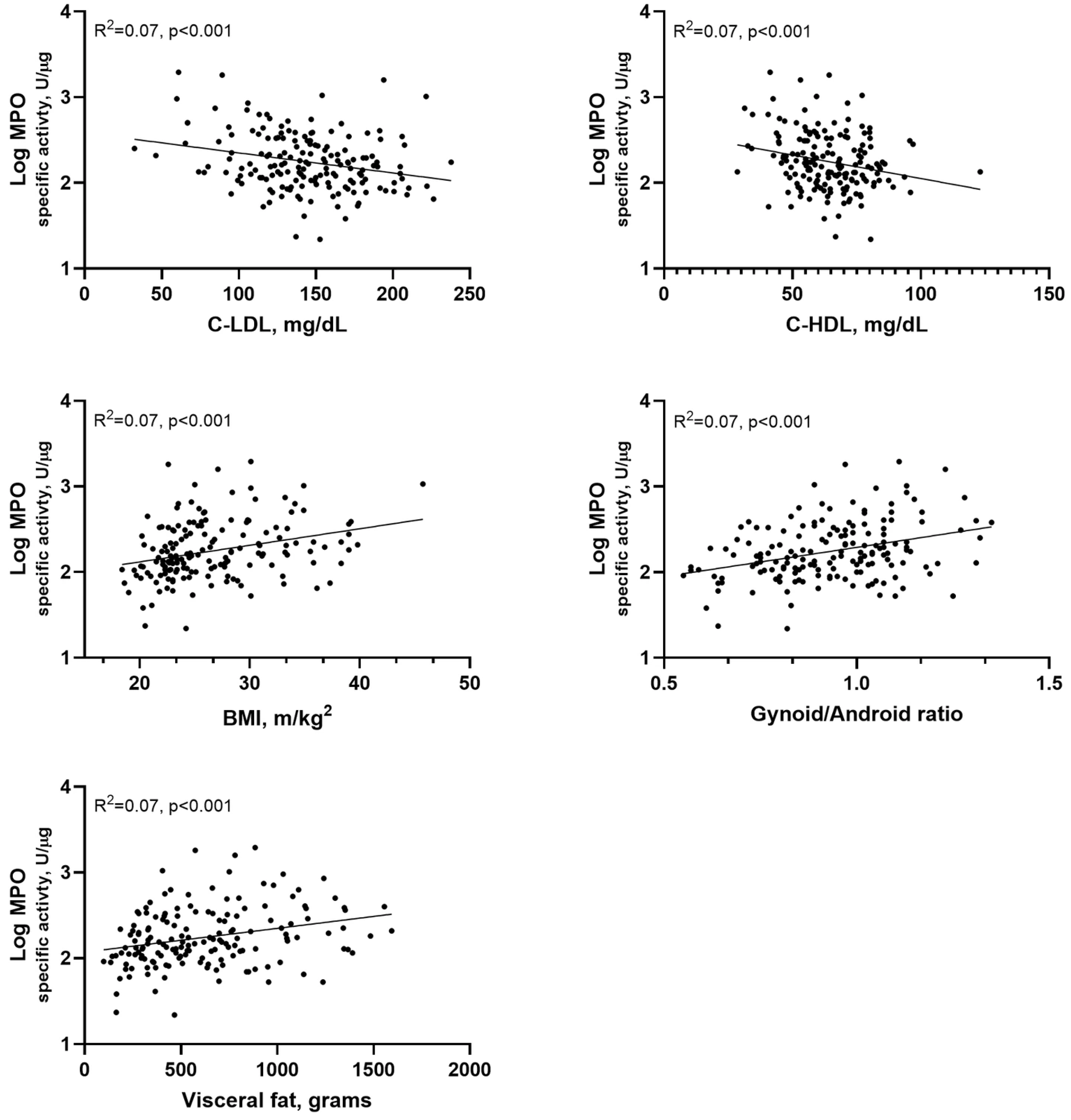 3.3. Relationship Between Myeloperoxidase (MPO) (Activity, Concentration, and -Specific Activity), Metabolic Parameters, and Body Fat Distribution
