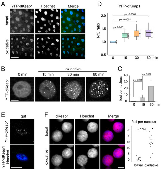 To investigate the behavior of dKeap1 in the living cell, we expressed YFP-dKeap1 in salivary gland cells using the Sgs3-GAL4 driver [30]. YFP-dKeap1 localized to both the cytoplasm and nucleus but was enriched in the nucleus (Figure 1A,B), consistent with our previous observation [14,19]. Interestingly, when leaving the tissue in PBS for 15 min or longer, YFP-dKeap1 began to form multiple foci in the nucleus (Figure S1A).