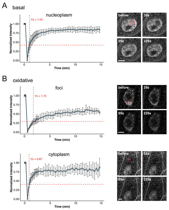 dKeap1 proteins exhibit reduced mobility in foci: (A) FRAP analysis of YFP-dKeap1 under basal conditions. Selective regions of salivary gland nuclei were photobleached, and fluorescence recovery was measured over time and plotted in a curve. Error bars indicate the standard deviation of 5 independent experiments. (B) FRAP analysis of YFP-dKeap1 under oxidative stress. Salivary glands were treated with H2O2 for 30 min prior to bleaching. Selective nuclear foci or cytoplasmic regions were bleached, and fluorescence recovery was recorded and plotted. Error bars indicate standard deviation from 5 independent experiments. Half-recovery times (t½) were calculated by linear interpolation at 50% of the recovery amplitude (horizonal red dash lines) using the normalized intensity values. Right: Representative images of a cell before and at the indicated time points after bleaching. The bleached region is highlighted by a red circle. Scale bars: 10 μm.