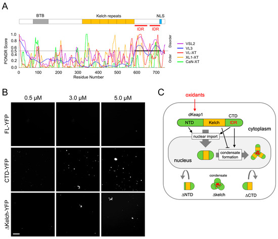 The nuclear foci formed by YFP-dKeap1 are likely biomolecular condensates. Using the Predictor of Natural Disordered Regions (PONDR) [36], we identified two intrinsic disorder regions (IDRs) within the CTD of dKeap1 (Figure 4A), suggesting a potential for phase separation-driven condensate formation. To test this hypothesis, we generated and purified dKeap1-YFP, dKeap1-CTD-YFP, and dKeap1-ΔKelch-YFP fusion proteins and performed in vitro phase separation assays. dKeap1-CTD-YFP robustly formed condensates in a concentration-dependent manner (Figure 4B). In contrast, full-length dKeap1-YFP (FL-YFP) did not phase separate (Figure 4B), consistent with our in vivo findings that YFP-dKeap1 does not spontaneously form foci under basal conditions (Figure 1A and Figure 3B). Notably, dKeap1-ΔKelch-YFP formed condensates in vitro (Figure 4B), aligning with the observation that YFP-dKeap1-ΔKelch forms cytoplasmic foci in cells even without oxidative stress. It is also notable that the efficiency of dKeap1-ΔKelch-YFP condensate formation was lower than that of CTD-YFP, indicating that other regions of dKeap1 influence but do not block CTD-mediated phase separation.