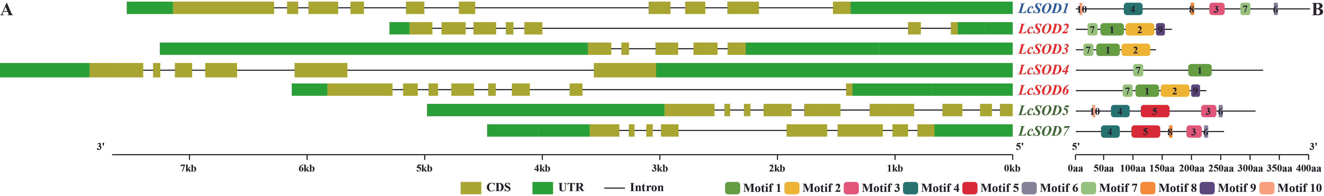 3.4. Phylogeny, Structures, and Motifs of the LcSOD Genes