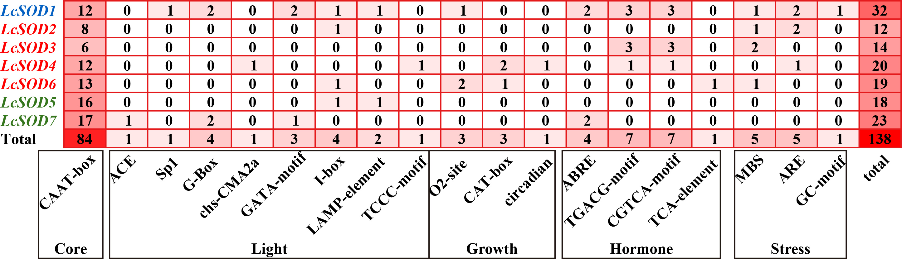 3.6. Cis-Acting Elements of the LcSOD Genes
