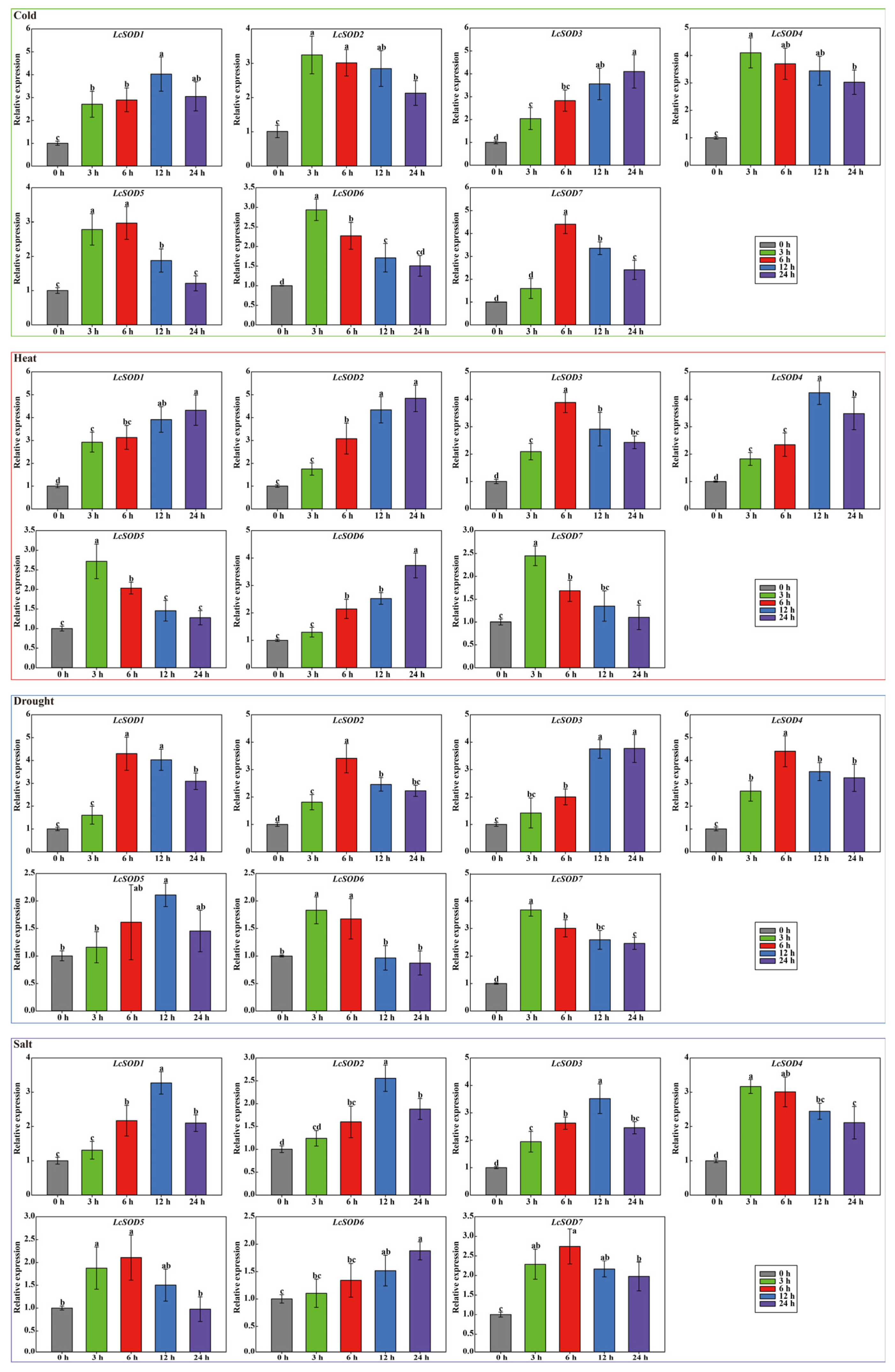 3.7. Expression Profiles of the LcSOD Genes in Various Tissues and Their Responses to Abiotic Stresses