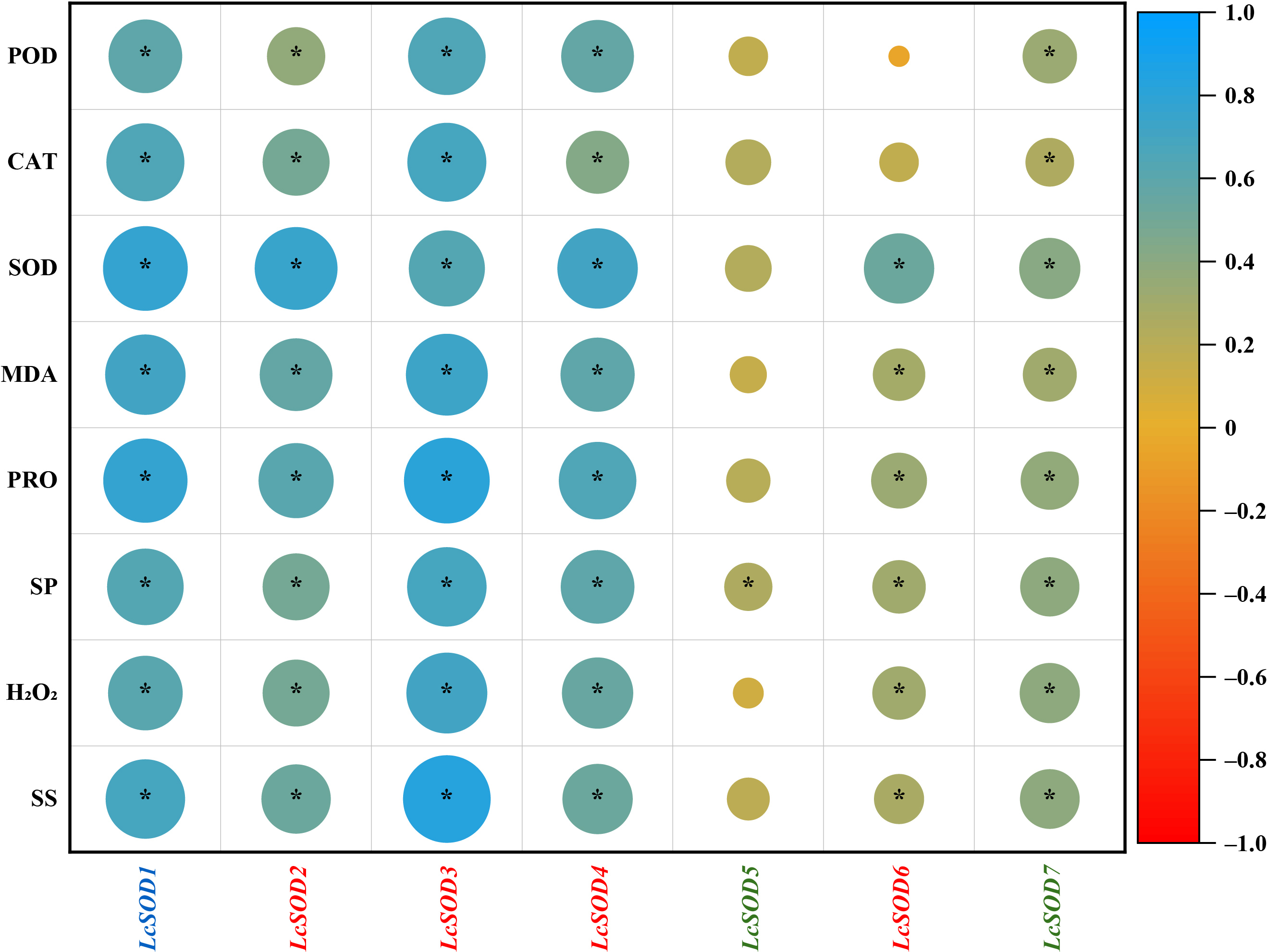 3.9. Correlations Between the LcSOD Gene Expression Levels and Physiological Parameters of Litchi Leaves to Abiotic Stresses
