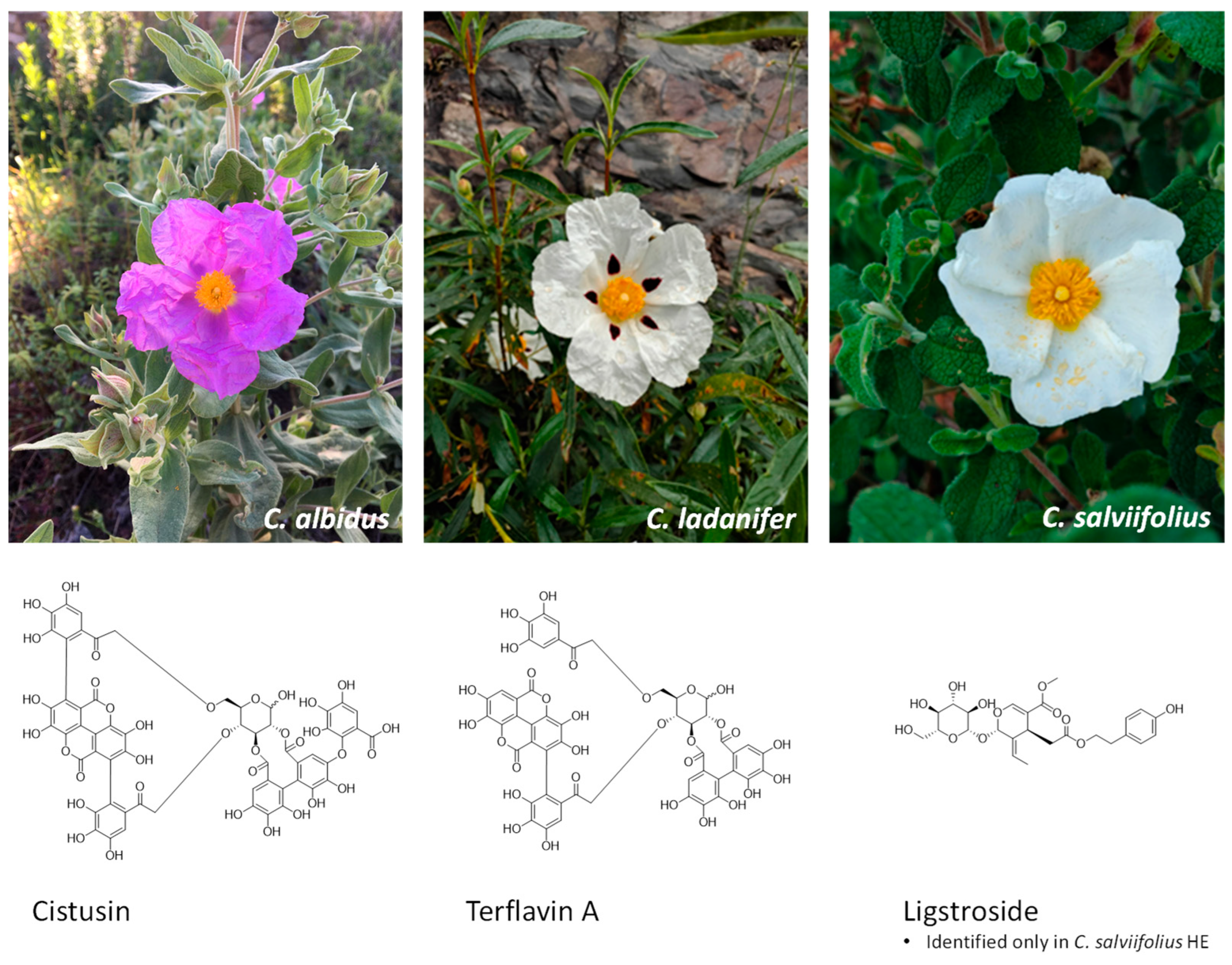 - Silva, A.R.; Ayuso, M.; García, P.A.; Barros, L.; Edrada-Ebel, R.A. Unveiling the Metabolites Underlying the Skin Anti-Ageing Properties of Cytinus hypocistis (L.) L. through a Biochemometric Approach. Phytomedicine 2024, 129, 155685. [Google Scholar] [CrossRef] [PubMed]