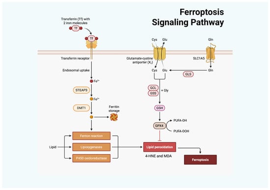 Ferroptosis is regulated by cellular iron and antioxidant metabolism. Transferrin delivers Fe3+ via the transferrin receptor, after which STEAP3 reduces it to Fe2+, and divalent metal transporter 1 (DMT1) mediates cellular import. Accumulated Fe2+ promotes OS through the Fenton reaction, lipoxygenases, and P450 oxidoreductase, thereby enhancing LPO. In parallel, Cys uptake through the Xc− antiporter supports GSH synthesis via GCL and glutathione synthetase (GSS). GSH serves as a substrate for GPX4 to detoxify lipid peroxides, with glutaminase (GLS)–derived Glu contributing to this process. GPX4 inhibition or insufficiency results in uncontrolled LPO and ferroptotic cell death. Created with BioRender.com.
