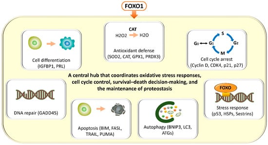 In general, FOXO transcription factors regulate a broad range of target genes involved in antioxidant defense (superoxide dismutase 2 (SOD2), catalase (CAT), glutathione peroxidase 1 (GPX1), peroxiredoxin 3 (PRDX3)), cell cycle arrest (cyclin D, cyclin-dependent kinase 4 (CDK4), cyclin-dependent kinase inhibitor 1A (CDKN1A, p21), cyclin-dependent kinase inhibitor 1B (CDKN1B, p27)), DNA repair (growth arrest and DNA damage–inducible 45 (GADD45)), apoptosis (Bcl-2–interacting mediator of cell death (BCL2L11, BIM), Fas ligand (CD95L, FASL), TNF-related apoptosis-inducing ligand (TRAIL), p53 upregulated modulator of apoptosis (BBC3, PUMA)), autophagy (BCL2/adenovirus E1B 19 kDa protein–interacting protein 3 (BNIP3), microtubule-associated protein 1 light chain 3 (MAP1LC3, LC3), autophagy-related genes (ATG)), and stress responses (heat shock proteins (HSP), sestrins (SESN)) [14,15] (Figure 1). These findings have been demonstrated not only in in vitro systems such as mouse-derived fibroblasts and human colorectal cancer cell lines, but also across a wide range of pathological conditions, including human cancer tissues, neurodegenerative diseases, cardiovascular disorders, and metabolic diseases. FOXO transcription factors are evolutionarily conserved, and studies in animal models such as Hydra, nematodes (C. elegans), Drosophila, and mice suggest that they play a critical role in lifespan regulation [15]. Collectively, FOXO integrates cellular senescence, damage responses, and energy and oxidative stress management, thereby contributing to tissue homeostasis and maintenance of receptivity, while orchestrating the balance between cellular stress responses, survival, and death through multiple mechanisms.