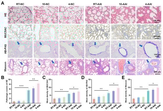 To investigate the effect of cold exposure on pathological changes in lung tissues of AAI mice, a comprehensive evaluation was performed using H&E staining, MUC5AC staining, Alcian AB-PAS staining, and Masson staining. As shown in Figure 2, H&E staining results revealed that there were no significant morphological changes in lung tissue sections of the 10-NC and 4-NC groups compared with the NC group. In contrast, all three AAI mouse groups exhibited prominent pathological alterations, including airway-specific changes (bronchiole wall thickening, goblet cell hyperplasia in airway epithelium) and pan-lung changes (alveolar septa thickening, alveolar fusion). Among all groups, the 4-AAI group showed the most severe pathological changes. Results of MUC5AC staining and AB-PAS staining showed that, compared with the NC group, the 10-NC and 4-NC groups exhibited no significant differences in MUC5AC expression or mucus expression. In contrast, the RT-AAI, 10-AAI, and 4-AAI groups had significantly increased expression of airway mucus. Additionally, similar findings were observed in Masson staining: the 4-AAI group showed the most prominent collagen deposition, and this deposition was significantly higher compared with that in the RT-AAI group. In summary, the aforementioned results collectively indicated that cold exposure could promote the expression of Th2-type cytokines, impair lung function, and exacerbate the symptoms of AAI. Particularly, the effect of 4 °C stimulation on AA was more pronounced compared with that of 10 °C stimulation. It was worth noting that histopathological analysis revealed obvious bronchial wall and peribronchial specific pathological changes. In the RT-AAI group, the abnormalities were mainly concentrated in the bronchi and the areas around the bronchi. Cold exposure further amplified this specificity: Compared with the RT-AA group, the 10-AAI group had intensified collagen deposition around the bronchi and hyperplasia of bronchial epithelial cup cells, while the 4-AAI group exhibited more severe but still airway-centered damage.