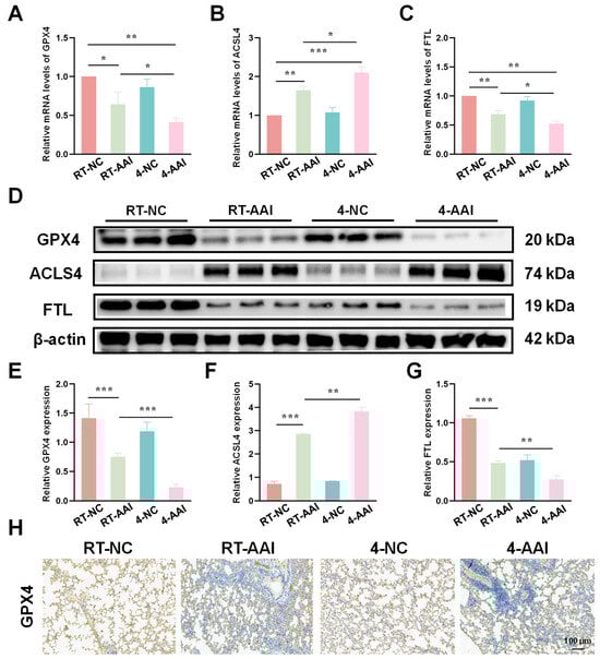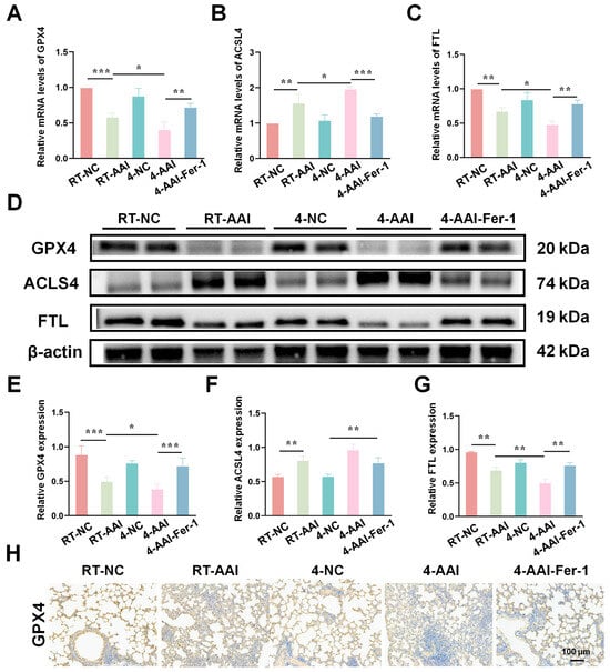 To elucidate the regulatory effects of different interventions on ferroptosis-related molecules in lung tissues, the mRNA and protein expression of key ferroptosis mediators were assessed. As shown in Figure 8A–C, qRT-PCR results indicated that compared with the RT-NC group, the mRNA level of GPX4 was decreased in the RT-AAI group, and further reduced in the 4-AAI group; Fer-1 treatment in the 4-AAI-Fer-1 group reversed this reduction. In contrast, the mRNA level of ACSL4 was elevated in the RT-AAI group, and more significantly increased in the 4-AAI group, with Fer-1 attenuating this elevation. The mRNA level of FTL showed a decrease in the RT-AA group, a notable decrease in the 4-AAI group, and a recovery upon Fer-1 treatment. Western blot analysis (Figure 8D–G) exhibited consistent trends at the protein level: GPX4 protein expression was down-regulated in the RT-AAI group, down-regulated again in the 4-AAI group, and up-regulated in the 4-AAI-Fer-1 group. ACSL4 protein expression displayed the opposite pattern, being up-regulated in the RT-AAI group, further up-regulated in the 4-AAI group, and down-regulated in the 4-AAI-Fer-1 group. FTL protein expression was reduced in the RT-AAI group, markedly decreased in the 4-AAI group, and increased in the 4-AAI-Fer-1 group. IHC staining (Figure 6H and Figure S4) further confirmed the changes in GPX4 distribution and expression in lung tissues, with distinct differences among the groups, which was consistent with the results of qRT-PCR and Western blot. Collectively, these findings suggested that different treatment regimens exert distinct regulatory effects on ferroptosis-related gene and protein expression in lung tissues, and Fer-1 could modulate these effects.