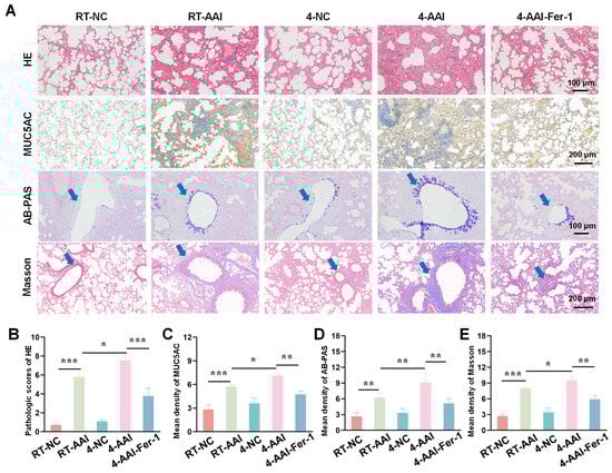 Building on the evidence that Fer-1 mitigated cold exposure-induced exacerbation of AAI-related cytokine dysregulation and lung function impairment, we further sought to assess the therapeutic effect of ferroptosis inhibition at the tissue structural level. To this end, we employed a series of histopathological staining techniques to systematically evaluate the extent of lung tissue damage, inflammatory infiltration, mucus hypersecretion, and collagen deposition-key pathological features of AAI-across different experimental groups. As shown in Figure 7A, HE staining revealed that compared with the RT-NC group, lung tissues in the RT-AAI group exhibited more severe inflammatory cell infiltration and structural disruption; the 4-AAI group showed further aggravated pathological changes, while no significant changes were observed in the 4-NC group, and the 4-AAI-Fer-1 group displayed alleviated pathology. MUC5AC, AB-PAS staining, and Masson staining were used to assess mucus production and collagen deposition, respectively. Quantitative analysis (Figure 7B–E) demonstrated that the RT-AAI group had significantly higher HE pathological scores, mean density of MUC5AC, mean density of AB-PAS, and mean density of Masson compared with the RT-NC group. The 4-AAI group showed even higher values in these parameters, whereas the 4-NC group had no significant changes, and Fer-1 treatment in the 4-AAI-Fer-1 group notably reduced these elevated indices. Collectively, these results indicated that cold exposure exacerbated AAI-related histopathological damage in mice, and Fer-1 could mitigate such damage.