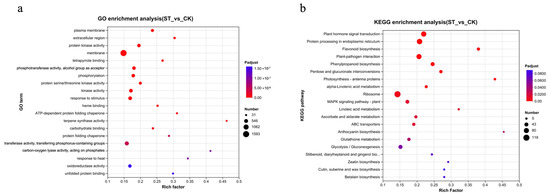 Enrichment analysis of DEGs in response to shading treatment. (a) Gene Ontology (GO) enrichment analysis bubble chart. The chart displays the most significantly enriched GO terms across the three ontologies: Biological Process (BP), Cellular Component (CC), and Molecular Function (MF). The size of the bubble represents the number of DEGs in that term, and the color indicates the level of statistical significance (−log10(adjusted p-value)). (b) Kyoto Encyclopedia of Genes and Genomes (KEGG) pathway enrichment analysis bubble chart. The chart shows the most significantly enriched metabolic and signal transduction pathways. Bubble size corresponds to the number of DEGs mapped to the pathway, and color represents the enrichment significance (−log10(adjusted p-value)).