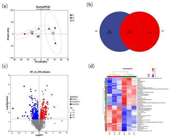 Compared with the ST group, metabolites such as Pro-His, Bisbynin, and Ecklonialactone A were significantly higher in CK than in ST; in contrast, metabolites including 1-(Indol-3-yl)propanol 3-phosphate, 1-Oleoyl Lysophosphatidic Acid, and 1-Palmitoyl Lysophosphatidic Acid were significantly lower in CK than in ST.