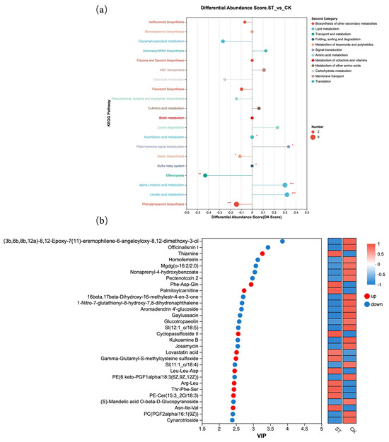 Figure 6 presents further analysis based on differential metabolites. Figure 6a shows the DA Score of different metabolites in KEGG pathways. Compared with the natural light group (CK), the metabolite contents in KEGG metabolic pathways such as Isoflavonoid biosynthesis, Flavonoid biosynthesis, and Phenylpropanoid biosynthesis were lower; all three pathways belong to “Biosynthesis of other secondary metabolites” in the Second Category. Additionally, the Galactose metabolism pathway under Carbohydrate metabolism also exhibited lower metabolite levels. In contrast, compared with the CK group, the ST group showed higher metabolite contents in KEGG pathways including alpha-Linolenic acid metabolism and Linoleic acid metabolism, which are classified under Lipid metabolism. Figure 6b displayed the top 30 differential metabolites with the highest VIP scores between the CK and ST groups.