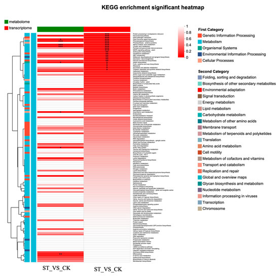 KEGG enrichment analysis heatmap based on combined transcriptomic and metabolomic analysis. Asterisks indicate statistical significance levels: * indicates a 0.01 < ** p < 0.05. *** indicates a p-value < 0.001.
