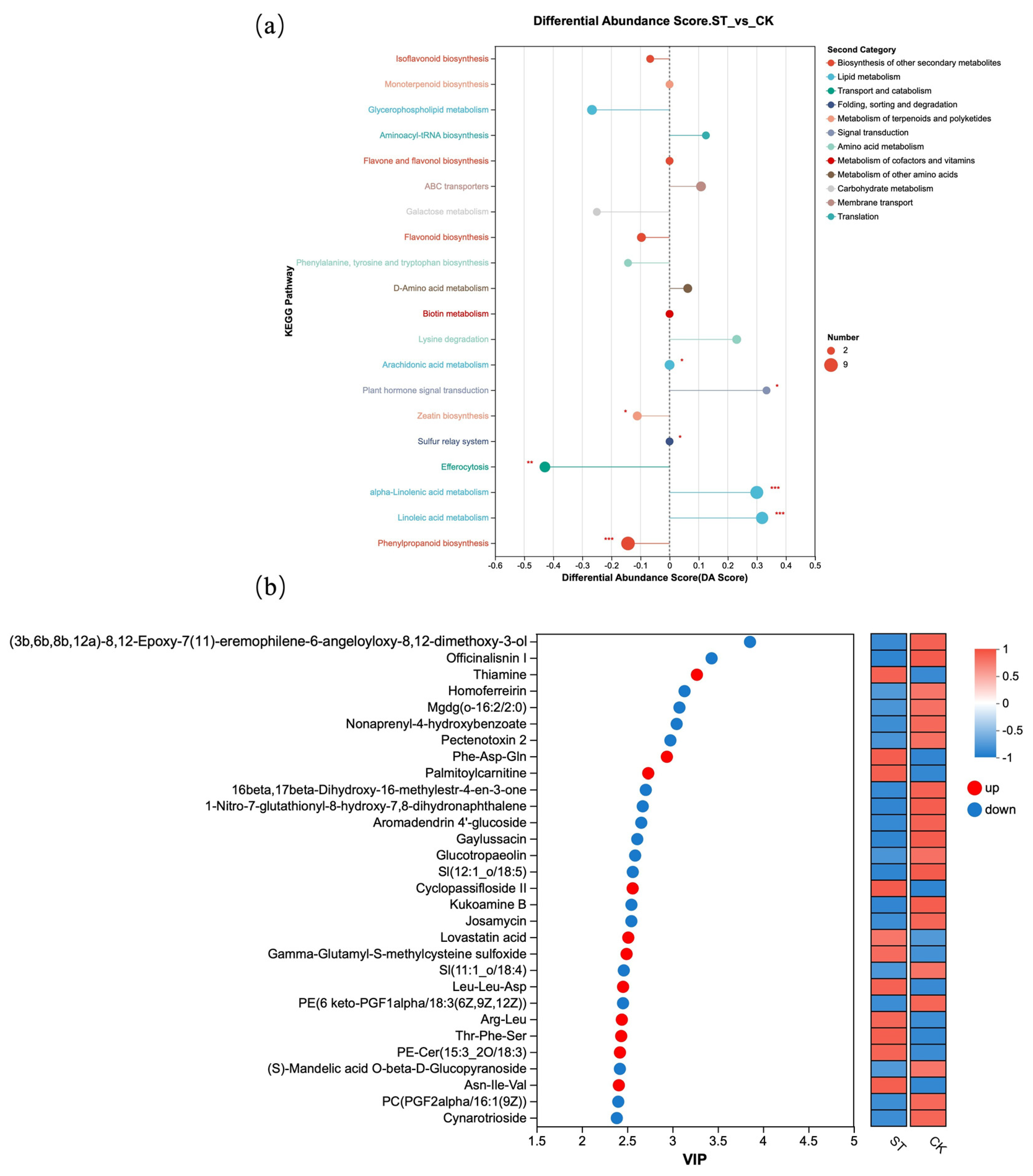 3.6. Combined Transcriptomic and Metabolomic Analysis of Edible Grass Leaves